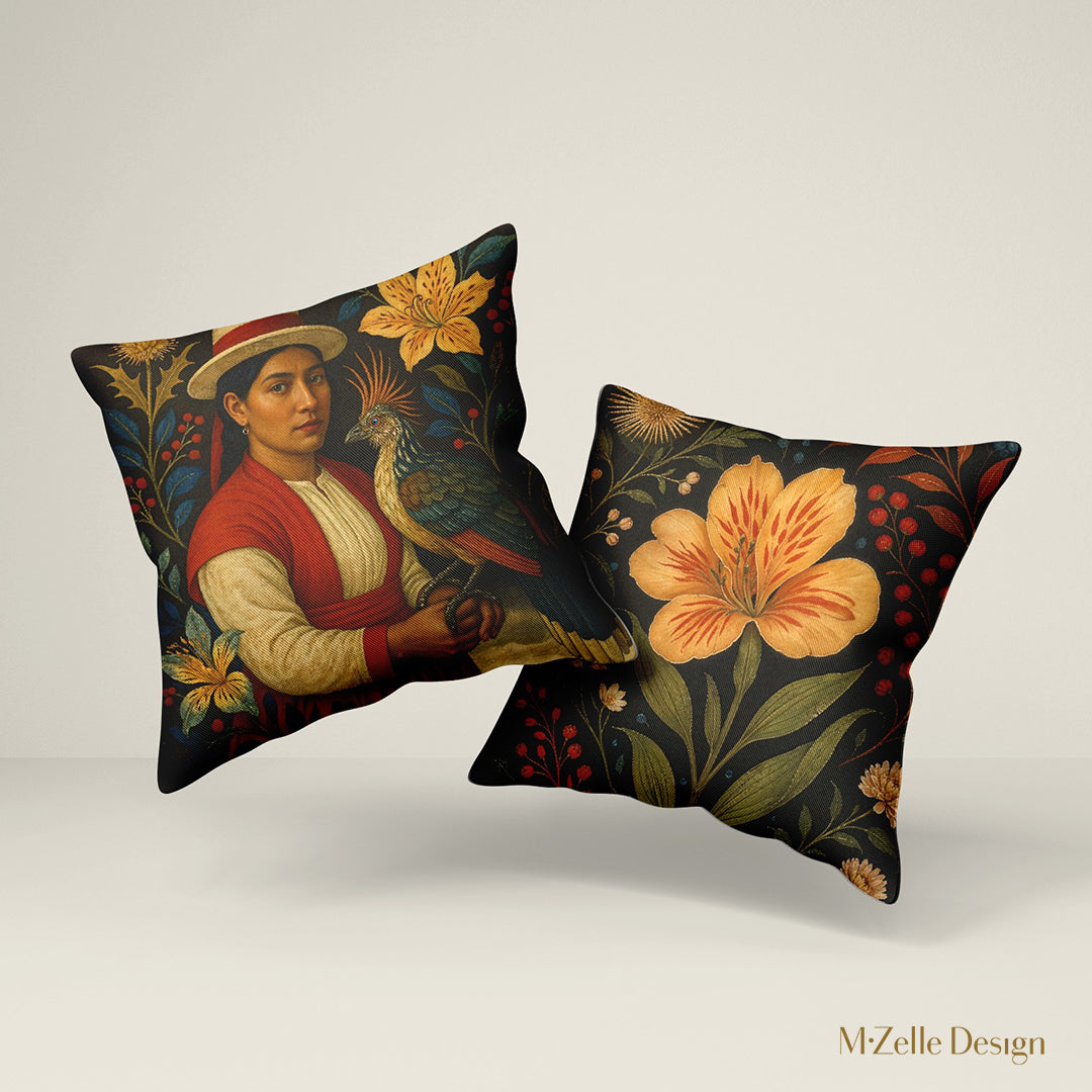 Housse décorative satinée 45 et 55cm - Un duo improbable qui fascine, comme si l’art de Vermeer rencontrait la luxuriance tropicale de Gauguin. Teodocia au port altier, s’accompagne de la silhouette insolite du hoazin, oiseau amazonien à la beauté primitive et à la huppe flamboyante, qui semble tout droit issu d’un bestiaire ancien.