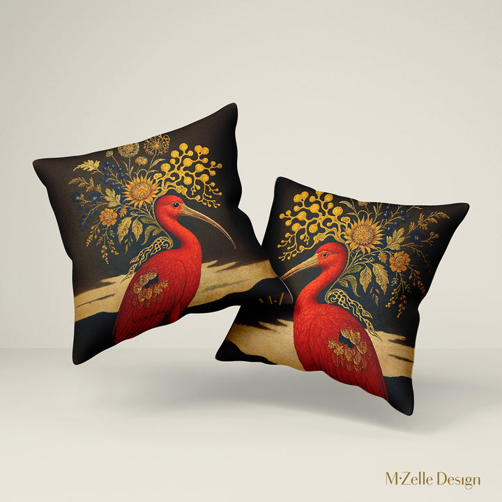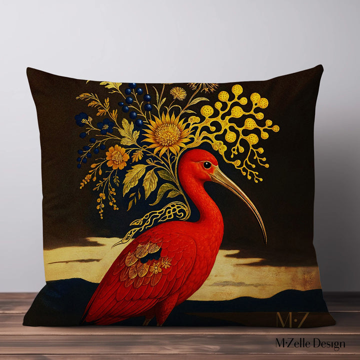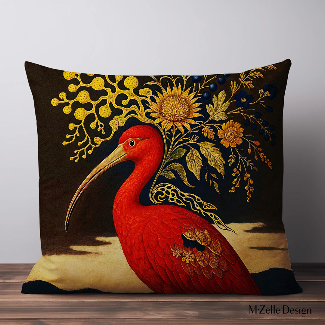 Housse décorative aspect lin 45 et 55cm - Un design naturaliste haut de gamme qui plaira aux ornithophiles, avec ce superbe Ibis rouge d'Amérique du sud, posant avec élégance sur un fond marron chocolat. Le décor végétal, où éclatent fleurs, baies et feuillages colorés, lui crée son panache singulier.